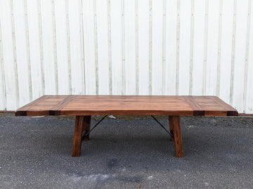 Rustic Walnut 42" x 84" Plank Turnbuckle Trestle Extension Table With 2 @ 18" Leaves On Ends Hard Oil Finish